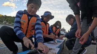 釣り上げた魚は中学生メンバーによる魚捌き講座を開いてもらい、みんなで鱗や内蔵を捌いていきました。
