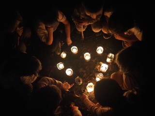 食後の片付けを済ませてランタンに点火。みんなのランタンでハートの火文字を作りました