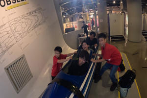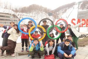 ラージヒルの大倉山ジャンプ競技場の前で写真を撮ったら、お待ちかねの夜ごはんへ!