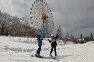 昨日のロングコースを滑っていくと、ゆうえんちの跡地を発見。