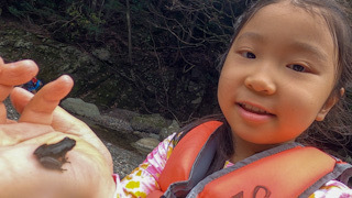 カジカを網ですくったり、カニやカエルも捕まえました。