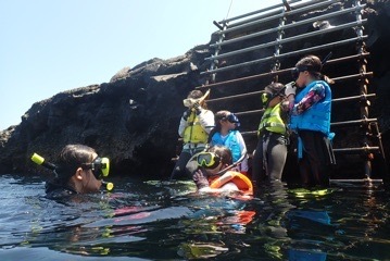 魚肉ソーセージを片手に魚たちに餌やりをしながらスノーケルに挑戦する子たちも。