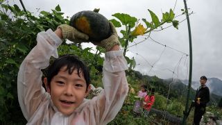 まずが子どもの顔の大きさくらいはあるかぼちゃを収穫。