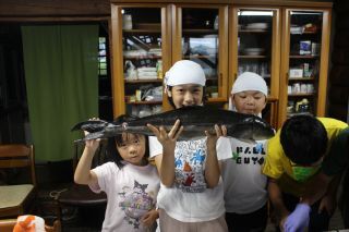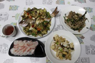 「真鯛採れたて野菜(ナス・トマト・ピーマン)のアクアパッツァ」「ナスとネギの中華炒め」「ヤンバルスギの唐揚げ」「ヤンバルスギの刺身」「しそジュース」など豪華絢爛になりました。