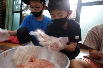 幼児班とムッキー班を中心に、まずは玉ねぎをむいてみじん切り。