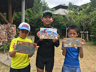 クラフト工作では海岸に貝や白砂、漂流物を拾いダンボールに貼り付けてオリジナルの砂絵を作っていきます。