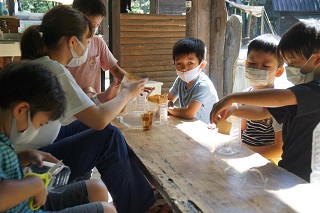 朝ごはんに出たジュースの入っていたペットボトルを使って、魚を捕まえるためのアイテム作りをしている班がありました。