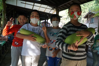 夕食の食材が届くと、特大のナガユウガオが子どもたちの目を引きます。