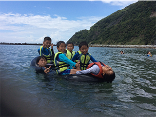 幼児、低学年の班は直ぐにスノーケリングは飽きて、タイヤチューブに乗ったり、砂遊びをしていました。