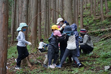 基地を作る中で、「何を作る?」「どんな材料がいるかな?」「これは使える?」「ちょっとここ持ってて」と子どもたち同士の会話が一気に増えてきます。